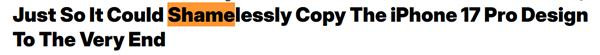 有博主对比了一款国产手机(应该就是荣耀Power2)与iPhone 17 Pro的相似之处,甚至为了模仿苹果,后置摄像头本来只有两颗、特意再添加一个装饰镜头。